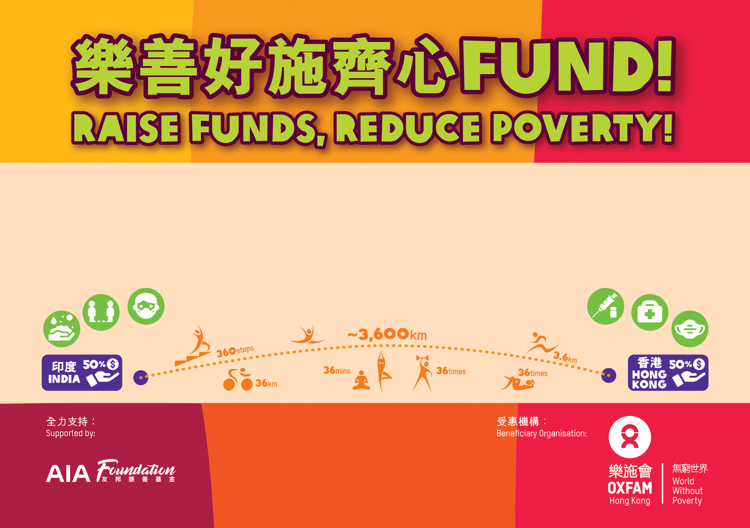 ► By participating in “Raise Funds, Reduce Poverty!” or made donations, you have read and agreed with the “Raise Funds, Reduce Poverty!” disclaimer. Participants who take part in this event do so entirely at their own risk and will not hold Oxfam Hong Kong (“OHK”), AIA International Limited (Incorporated in Bermuda with limited liability) ("AIA Hong Kong and Macau") and AIA Foundation (as the supporter of this event) responsible for death or any injury or for any damage to or loss or destruction of property or any other economic loss or for any consequential loss, in any such case arising from any accident or mishap or otherwise arising from or connected with this event. For further information, please refer to the disclaimer.