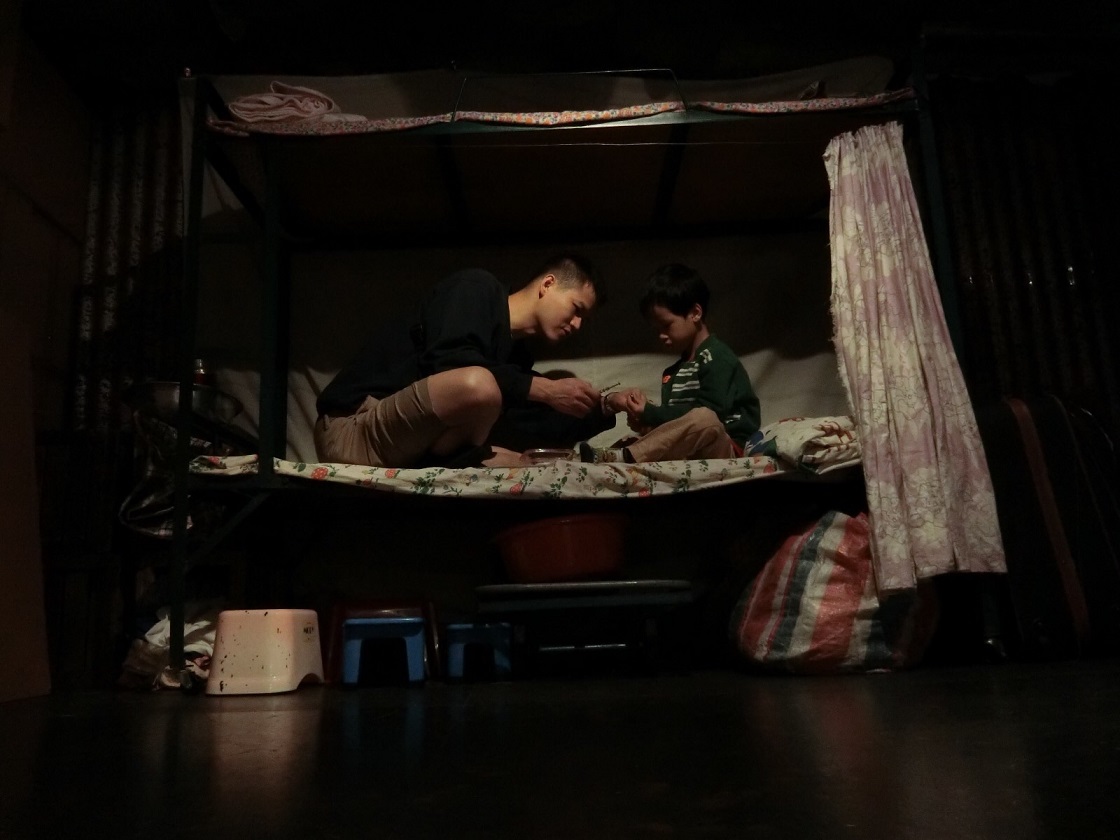 接著是多個場境體驗,由私樓、到農村、到劏房/籠屋、寮屋、紙皮箱。在每個場境都要工作,任務當然不一樣。看見紙箱,笑說昂藏六呎的爸爸抽到紙箱怎辦?還好,爸爸和昊昊(細孖)抽到劏房/籠屋,他們的任務是上螺絲帽。這任務我認為昊昊應該覺得挺有趣的,而且這任務沒有瞓紙箱的辛苦,但也能有體驗。不過昊昊只上了幾粒就開始叫悶,還偷走到隔離床位,結果要主持人長頸鹿叔叔(Kenny Or)出招召回,他問昊昊想喝點甚麼。昊說要綠茶,然後告訴他要努力工作賺錢才能買綠茶。我在另一處聽著,心想:孩子,你真幸福,如果你要這樣過活,這麼勞碌得來的錢,你會捨得用來得買綠茶嗎?