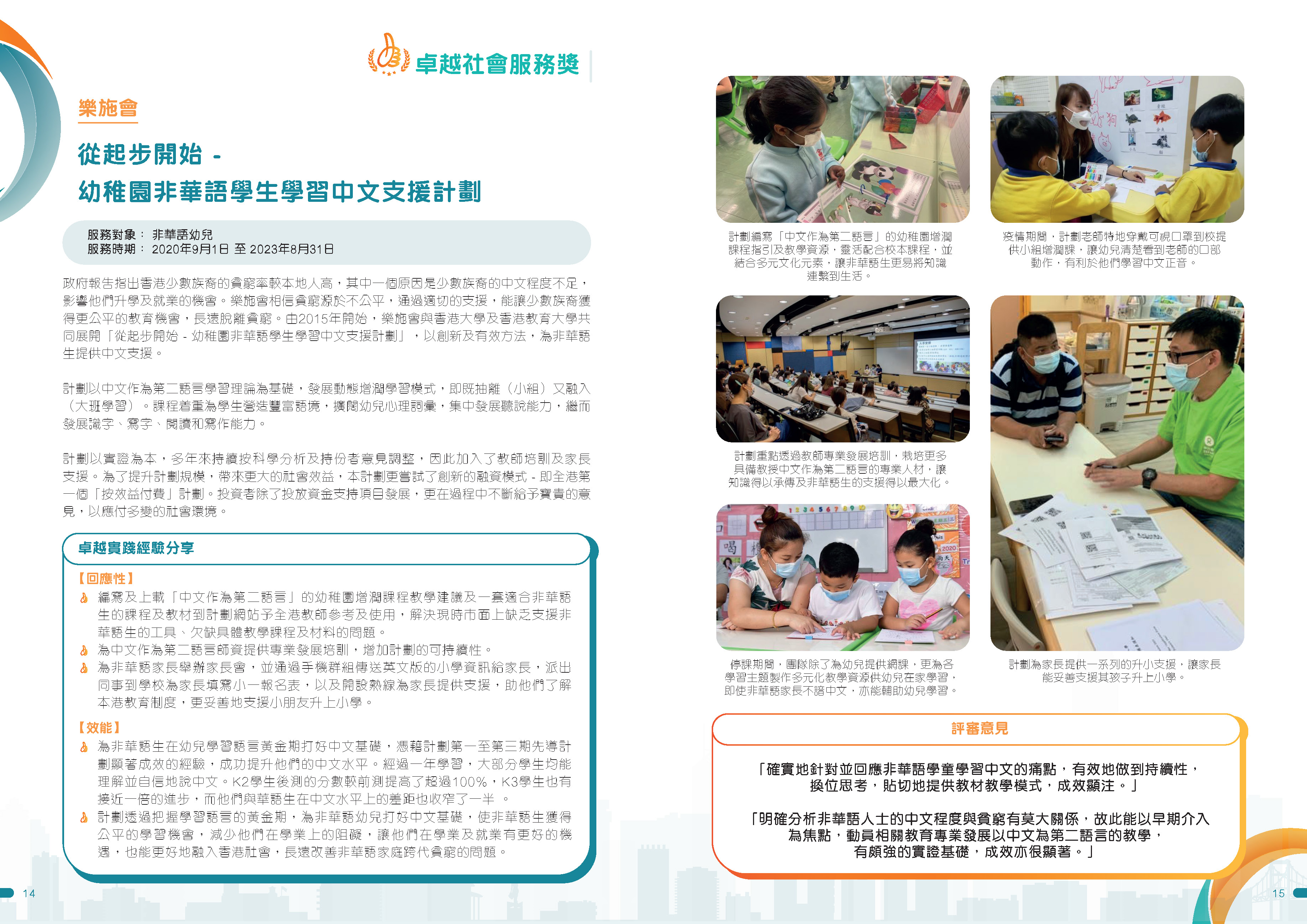 • 課程:為非華語幼兒提供動態中文增潤班 (以中文二語習得理論為基礎,切合非華語幼兒語文能力的發展特點及進程);