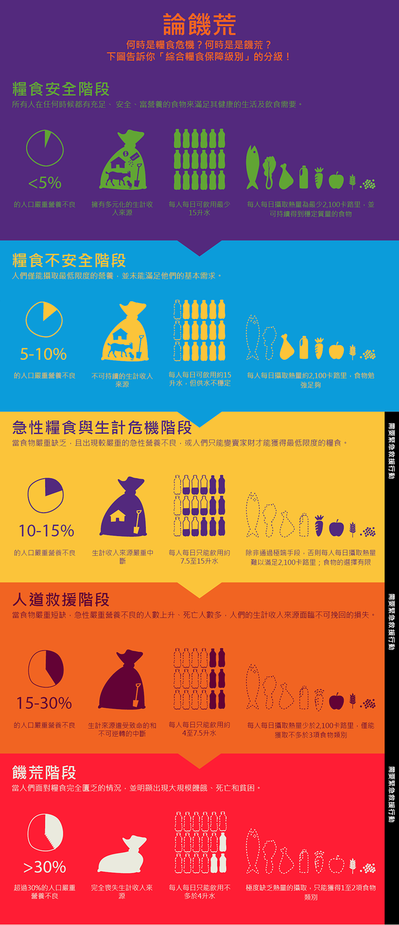 註:宣布饑荒須符合三個條件:1. 最少20%家庭面對難以克服的糧食短缺,亦即最少五分之一人持續無法每日攝取至少2100 卡路里;2. 每日每1 萬人中有超過兩人餓死;3. 超過30%人口因嚴重營養不良陷於死亡邊緣。
